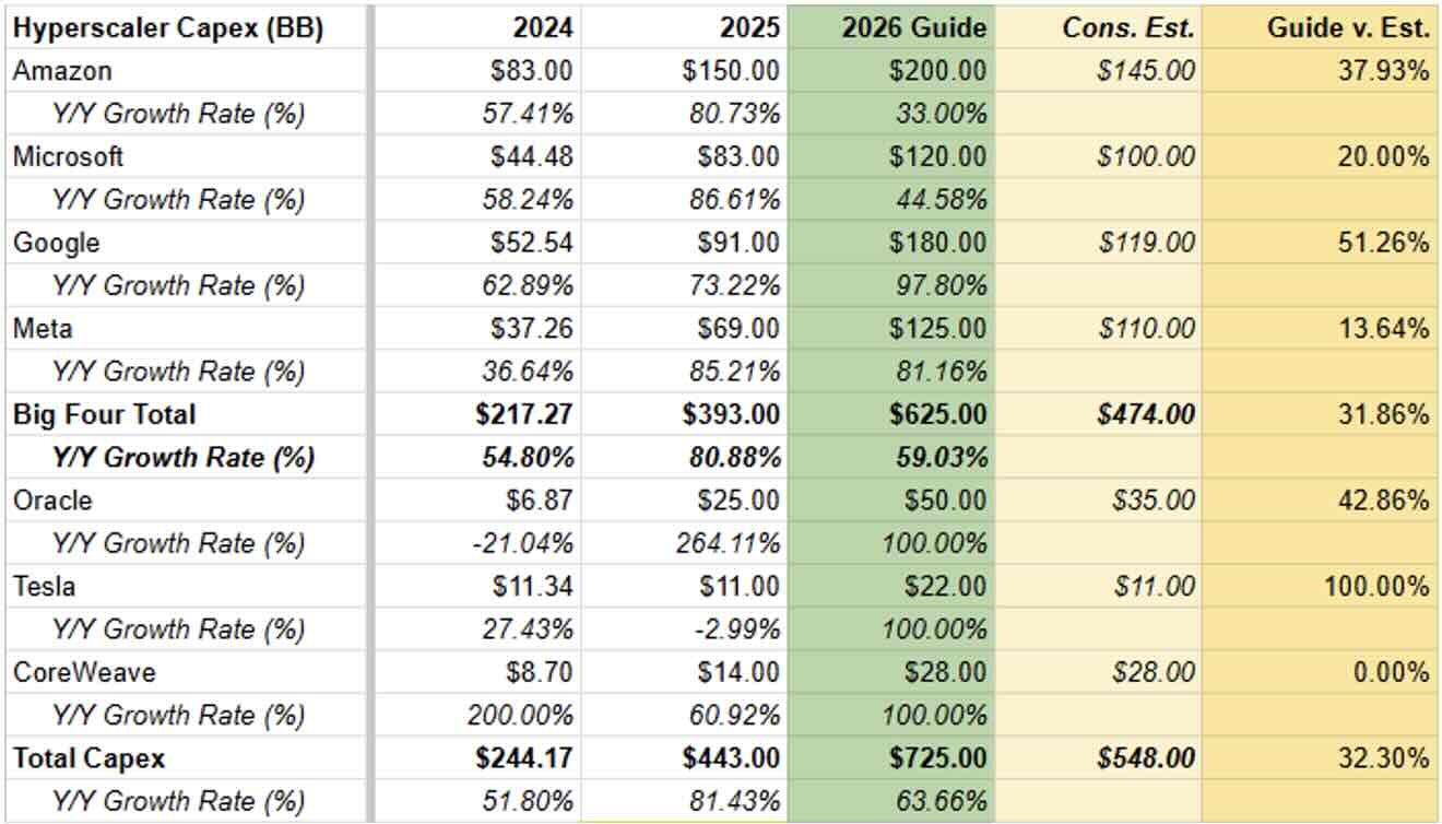 The hyperscalers’ 2026 capex guidance came in way above Wall Street expectations (32% higher) and is up significantly (about 63%) from last year. The hyperscalers are saying they will spend $625 billion between the four of them, and when you include other major players like Oracle, Tesla, and CoreWeave, we’re looking at $725 billion in capex in 2026.