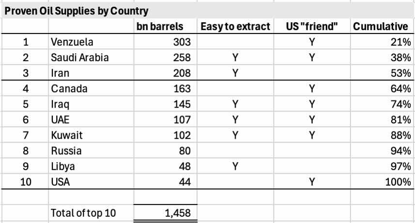 And strangely enough, Iran makes the top 3 in both lists. If you then consider that extraction of Iranian oil is relatively easy compared to what they make in Venezuela, the US oil companies will be given first pick of the spoils of war and a more secure and cheaper source of oil will flow on to global markets. The opex per barrel to get Iranian crude out of the ground is $5-8/bbl compared to $25 in Venezuela. The main issue, however, will be how much damage is done to the infrastructure during the Israeli/US bombings.