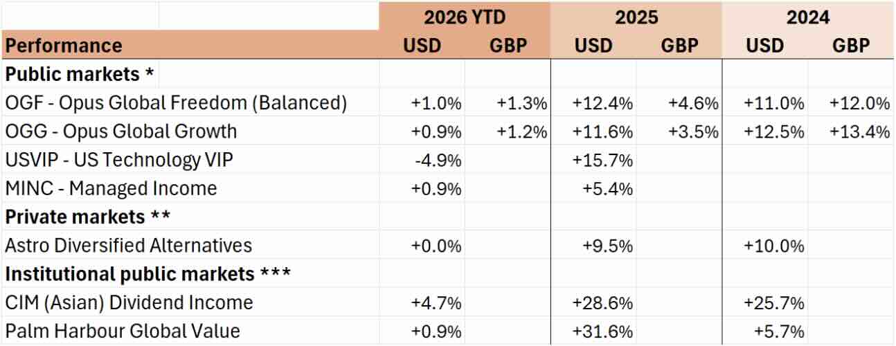 Capital at risk. Returns in US dollars unless otherwise stated. Source: * Estimates Freedom Asset Management as at 8/3/26. Please note depending upon how the funds are invested a small number of underlying funds can price 1-2 days after we take our estimates above so final published NAVs may vary. Estimated GBP returns are from a $1.25 FX rate on 31/12/24 and $1.34 as at 31/12/25. Please note launch dates of USVIP 12/2/25 and MINC 20/5/25. ** Note fund prices quarterly and includes 5% discount to NAV expressed as 5% performance above for 2024, note also that the 2025 estimate takes the MCAS December 2025 estimate and deducts the estimated charges of the Astro feeder fund. *** Morningstar as at 8/3/26, I shares for CIM Dividend Fund, F shares for PHC Global Value Fund.